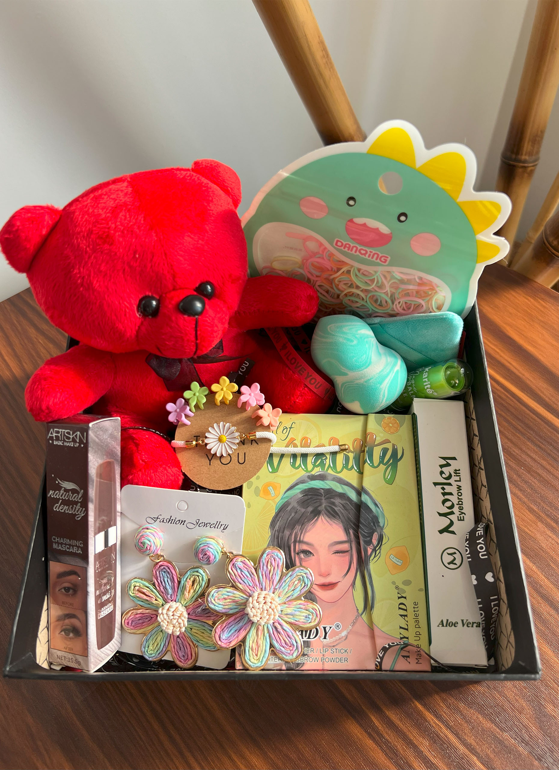 عروسک خرسی قرمز / ریمل قهوه ای ترند / ژل ابرو مورلی / بیوتی بلندر / پلت سایه 20 رنگ لاولی / گوشواره گلی کیوت / دستبند بابونه / بالم لب / پد آرایشی / کش چهل گیس دایناسوری / کلیپ مینی 5 عددی