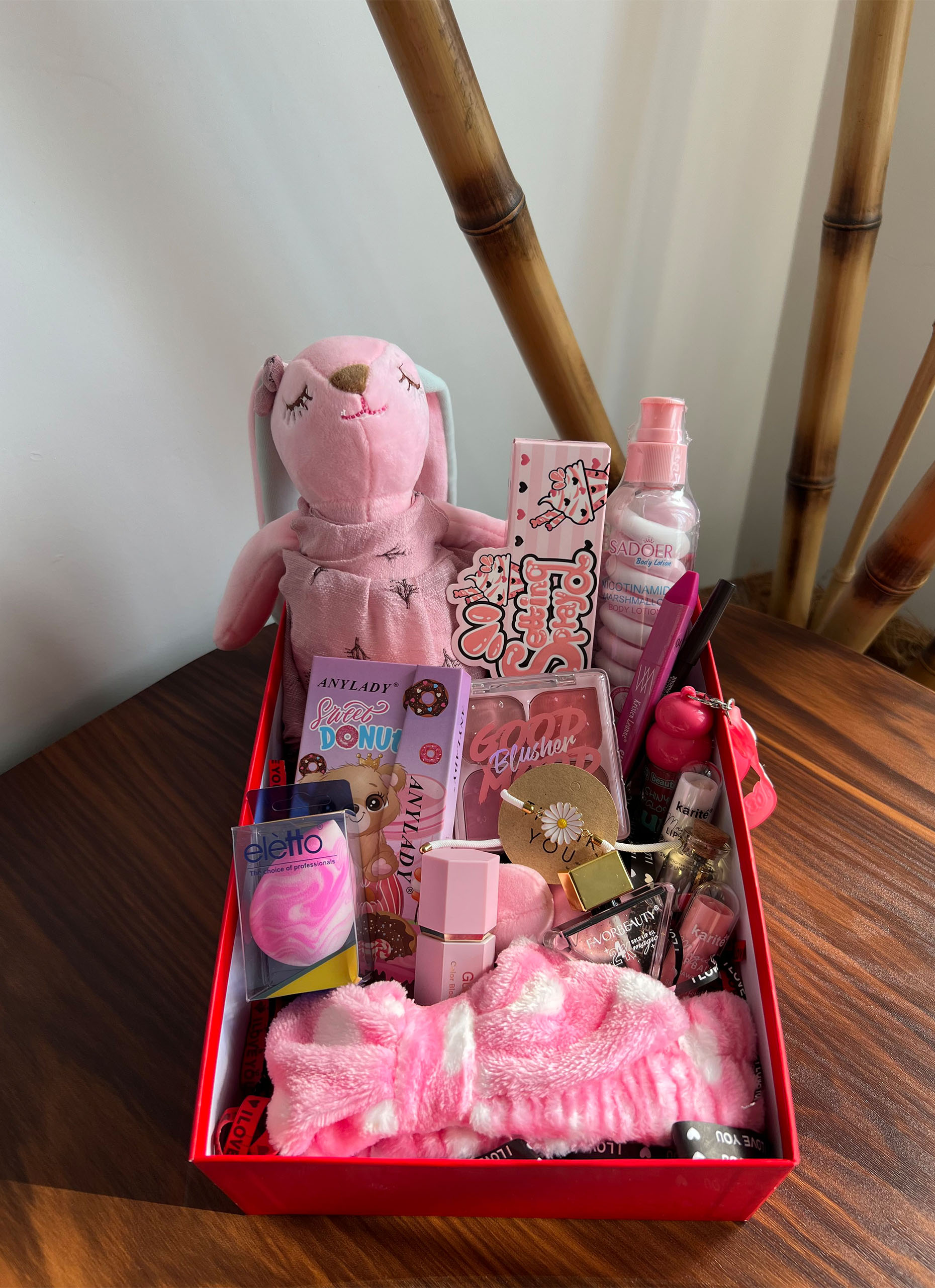 عروسک خرگوشی / فیکساتور صورتی کیوت / لوسیون مارشمالو / پلت سایه 18 رنگ ترکیبی LADY GRIL / بیوتی بلندر / رژگونه 4 عددی / 2 عدد بالم لب / برق لب مثلثی شاینی / رژلب مایع حجم دهنده عروسکی آویز دار / رژگونه مایع طرح شیگلم / خط چشم رنگی / مداد چشم فلورمار رنگی / هدبند صورتی / دستبند بابونه / شیشه عشق