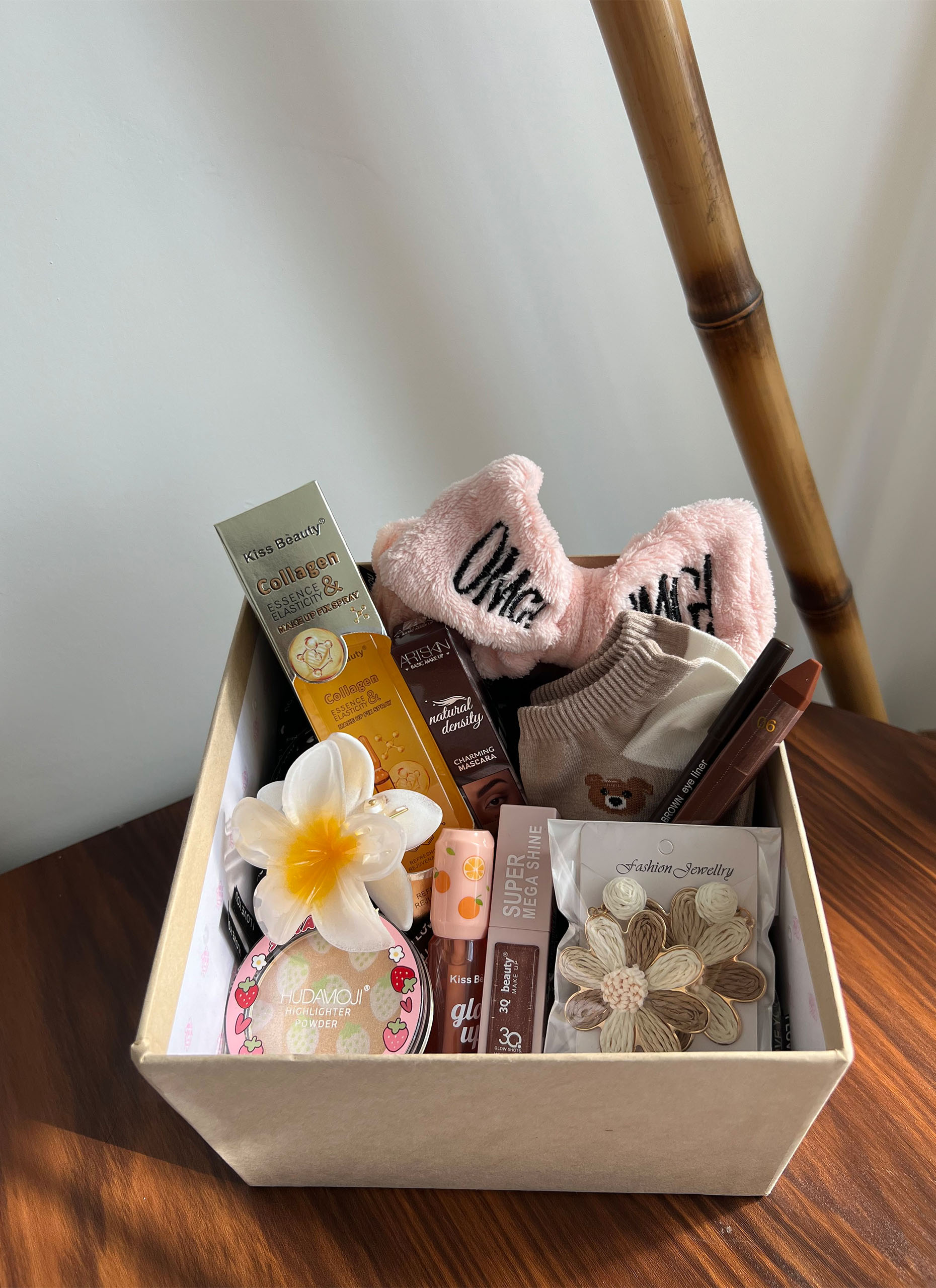 فیکساتور کیس بیوتی / ریمل قهوه ای آرت اسکین / رژ لب مایع شاینی میبلین / لیپ گلاس کیس بیوتی / خط چشم رنگی / مداد چشم فلورمار قهوه ای / هایلایتر هدی بیوتی / گوشواره حصیری / جوراب / هدبند / گلسر /هدبند