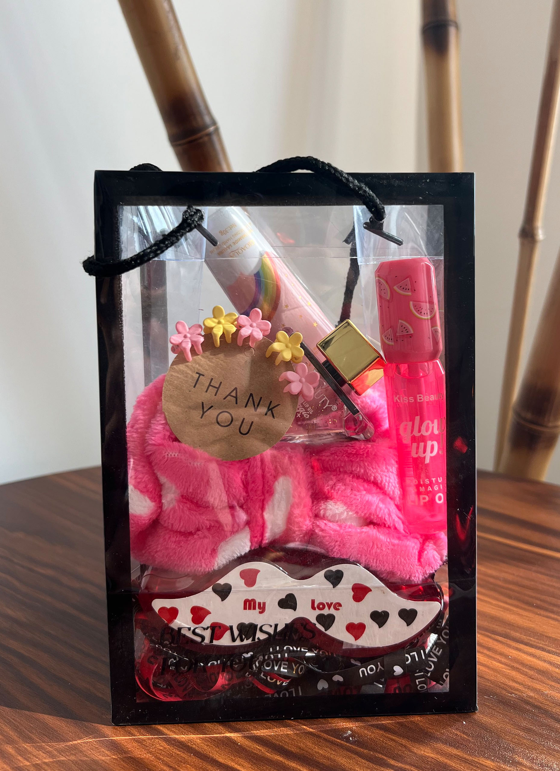 پک هدیه طلقی اقتصادی 1 شامل : هدبند صورتی پاپیونی / کرم دست / لیپ گلاس کیس بیوتی / برق لب شاین دار مثلثی / پک کلیپس مینی 5 تایی گل / پک اسمارتیز طرح اسمارتیز به همراه بگ طلقی و پوشال لاو