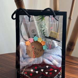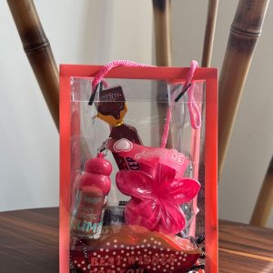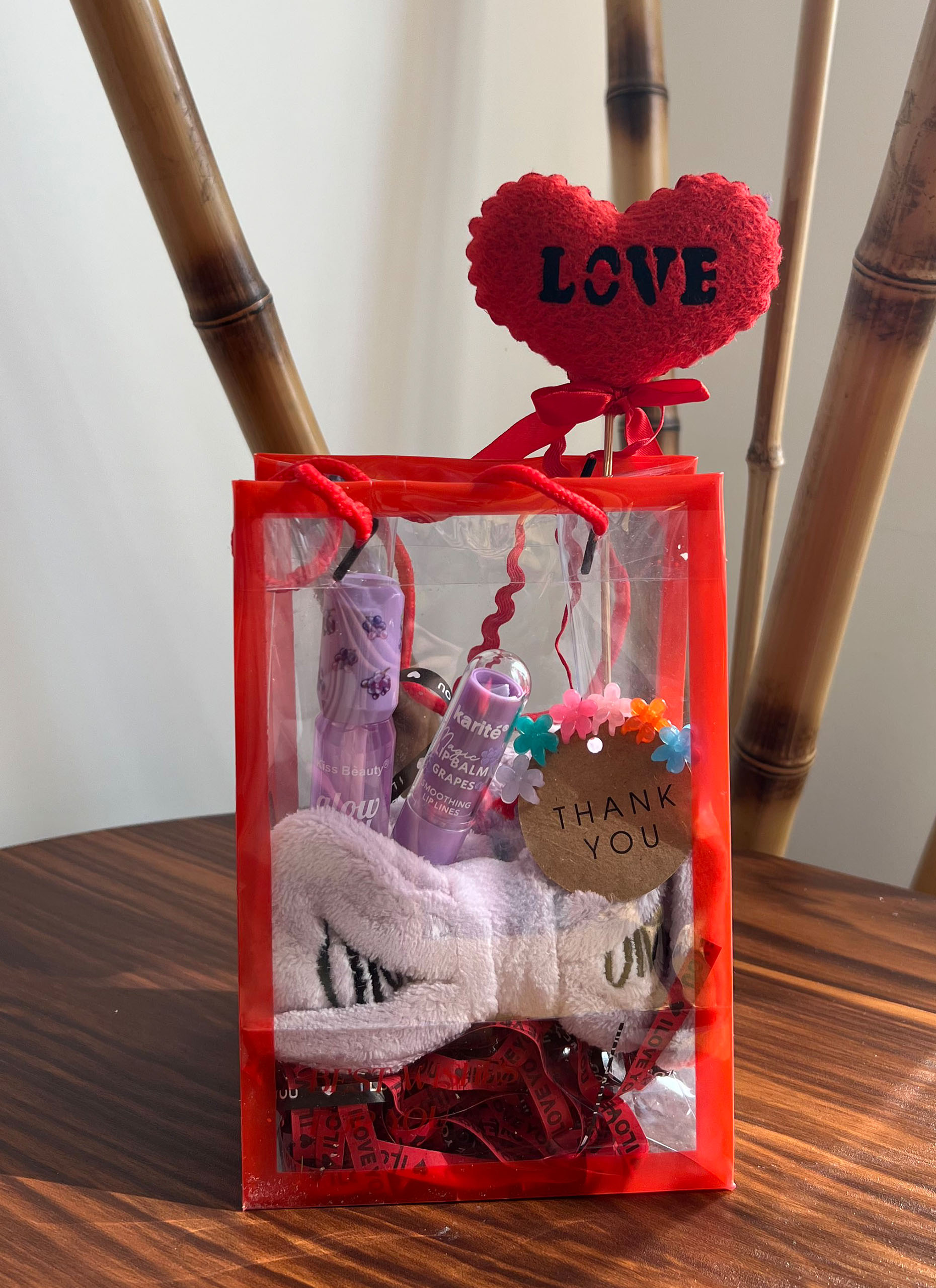لیپ گلاس کیس بیوتی / بالم لب پرپل / هدبند پاپیونی / پک کلیپس مینی 6 تایی / قلب نمدی لاو / به همراه بگ طلقی و پوشال لاو