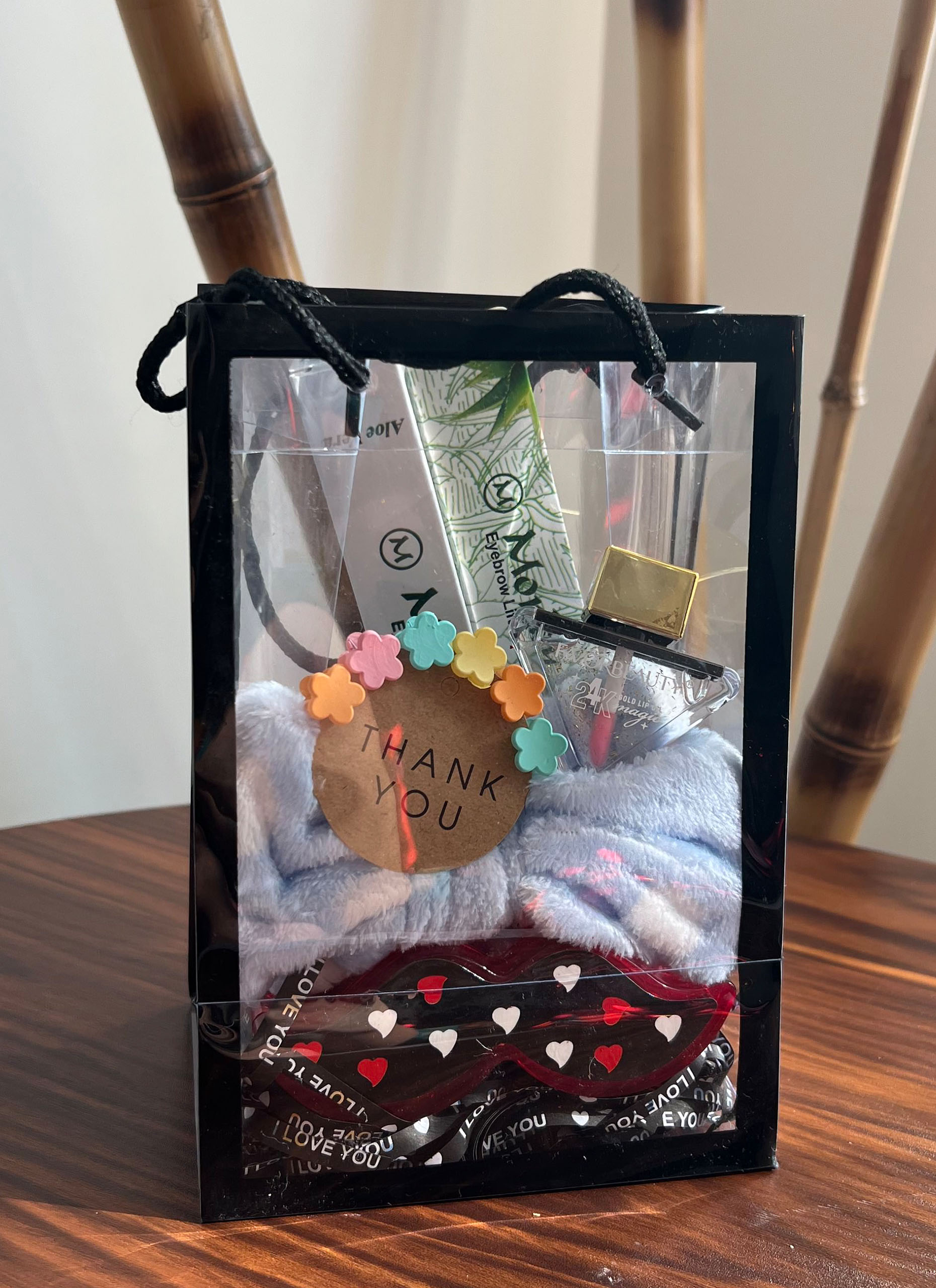 ژل ابروی مورلی / برق لب شاین دار مثلثی / هدبند پاپیونی / پک اسمارتیز طرح سیبیل / پک کلیپس مینی گل 6 تایی به همراه بگ طلقی و پوشال لاو