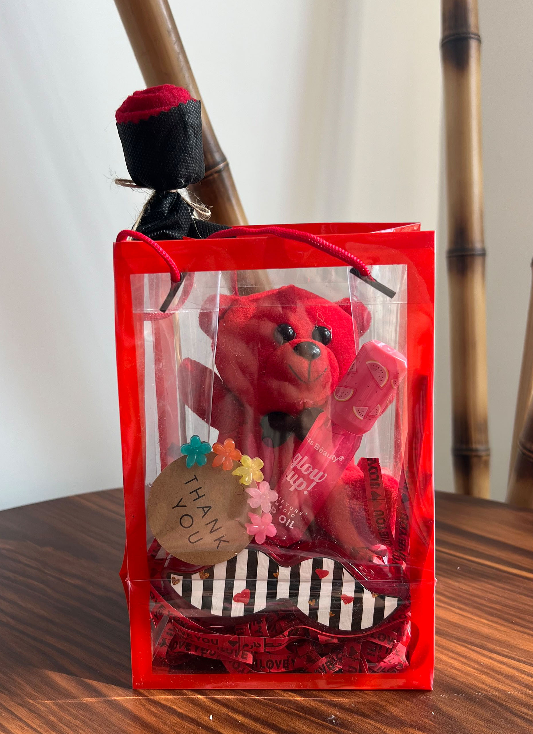 عروسک خرسی قرمز / لیپ گلاس کیس بیوتی / پک اسمارتیز طرح سیبیل / پک کلیپس مینی گل 5 تایی / شاخه گل رز نمدی به همراه بگ طلقی و پوشال لاو