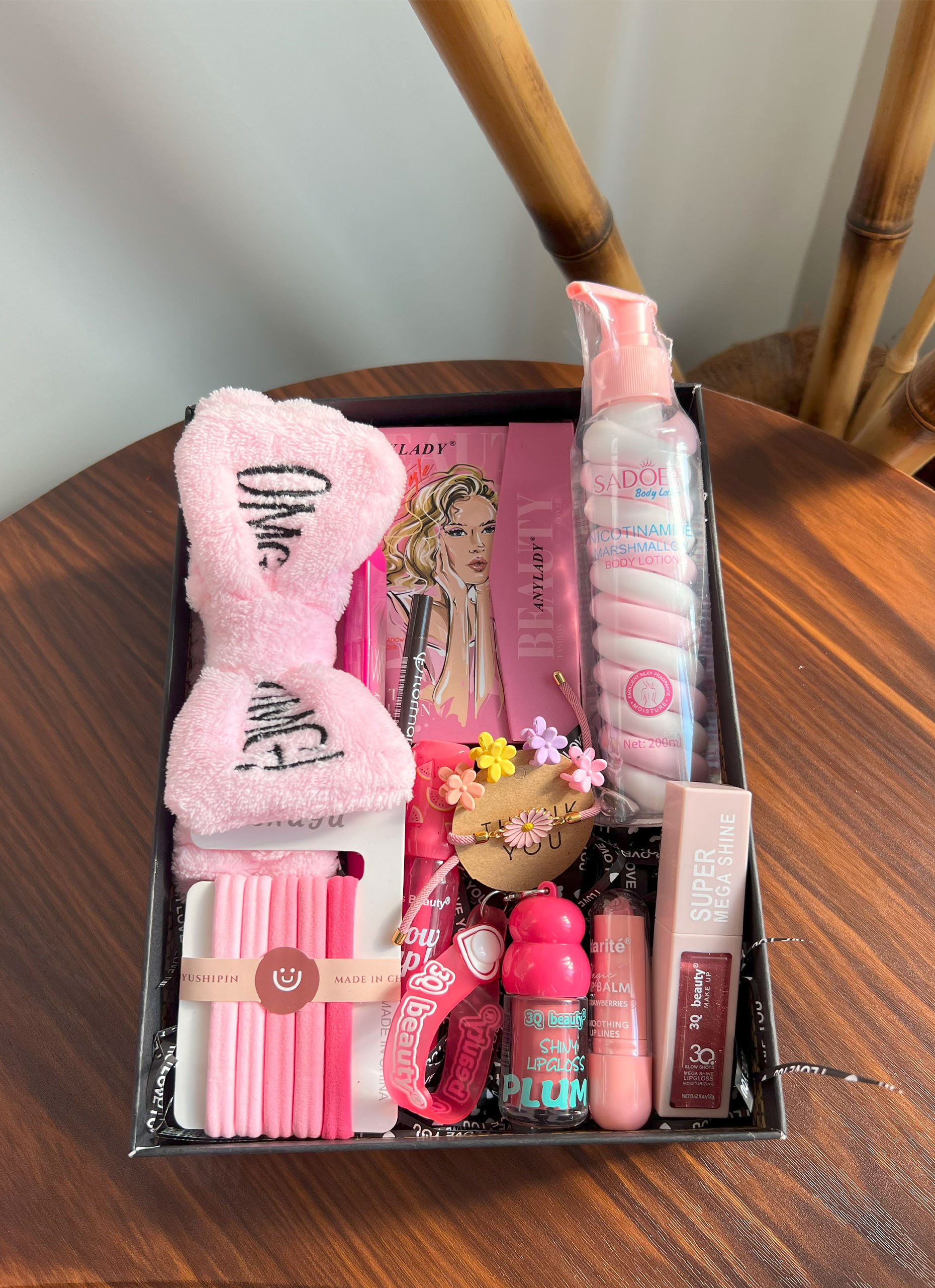 لوسیون مارشمالو / رژ لب حجم دهنده بیوتی آویزدار/رژ لب مایع شاینی میبلین / لیپ گلاس کیس بیوتی /پلت سایه 20 رنگ به همراه 4 رنگ رژ لب و رژ گونه و سایه ابرو / هدبند / دستبند بابونه / خط چشم رنگی / مداد چشم فلورمار / بالم لب / پک کش مو 4 عددی / کلیپس 4 عددی مینی